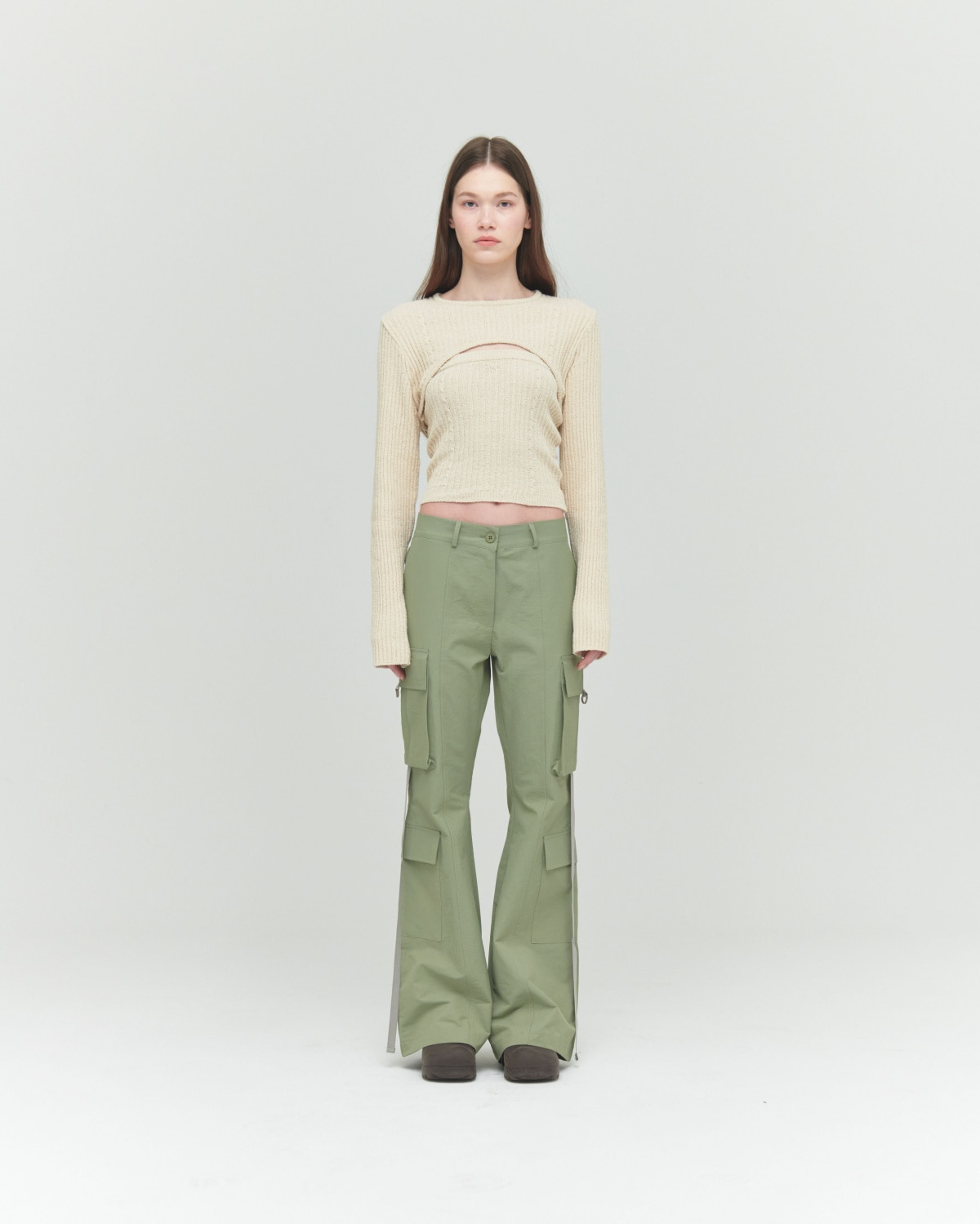 슬림한 라인의 세미 부츠컷 사이드 카고/스트랩 디테일 허리 뒷밴딩으로 편안한 착용감